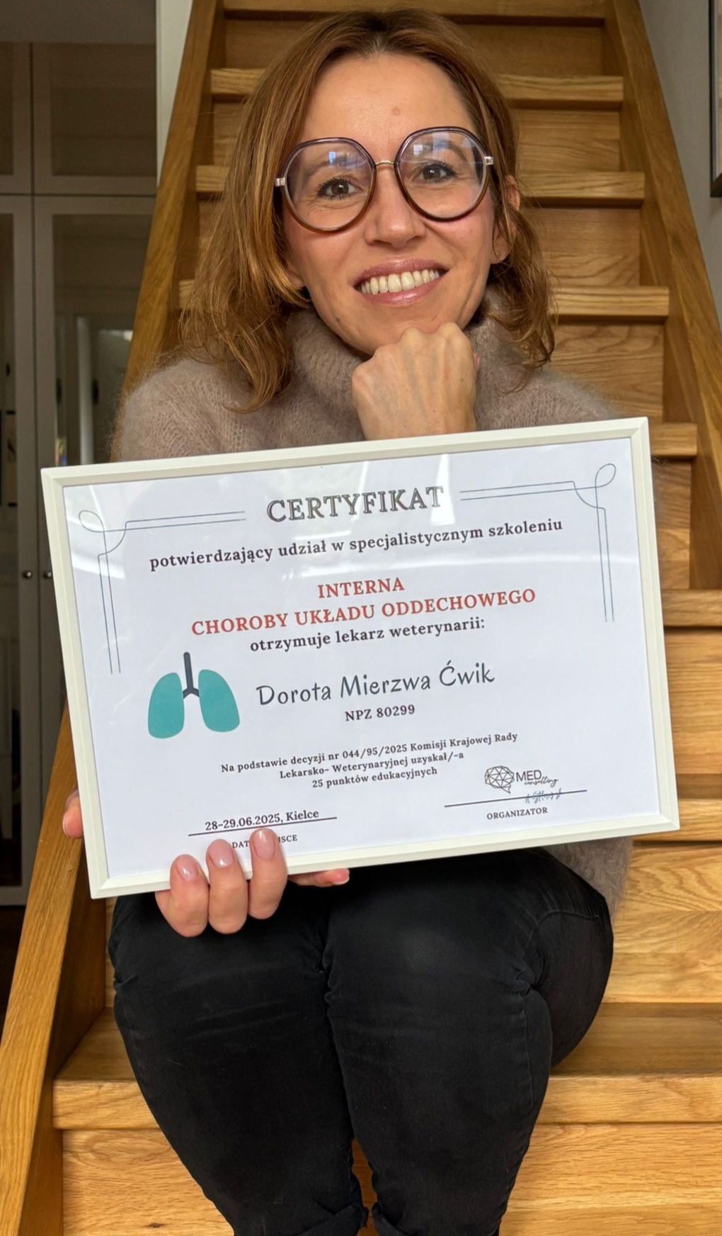 W dniach 28–29 czerwca 2025 lek. wet. Dorota Mierzwa‑Ćwik uczestniczyła w specjalistycznym szkoleniu internistycznym pt. „Choroby układu oddechowego psów i kotów”, które odbyło się w Kielcach.